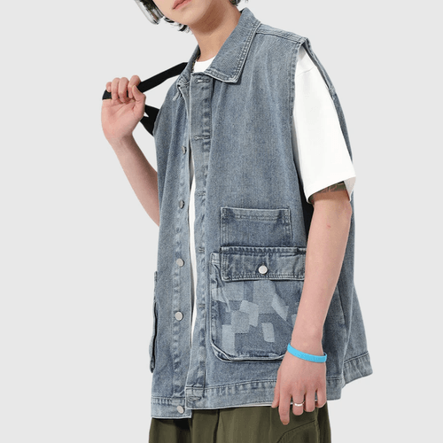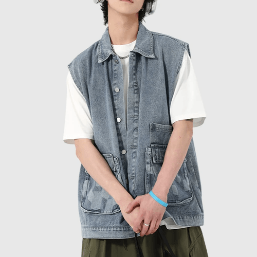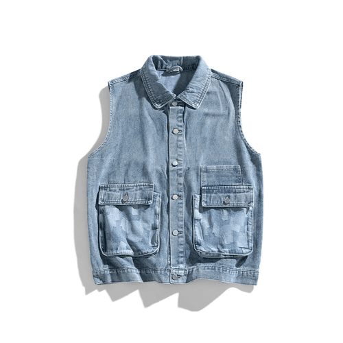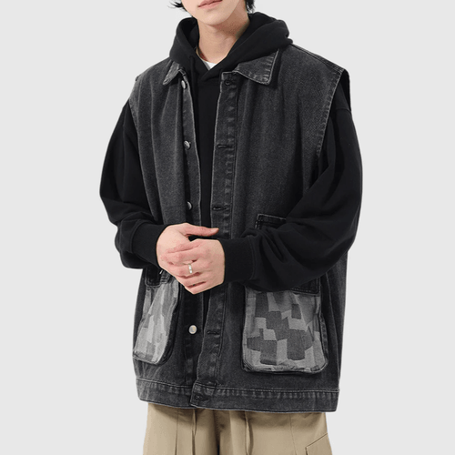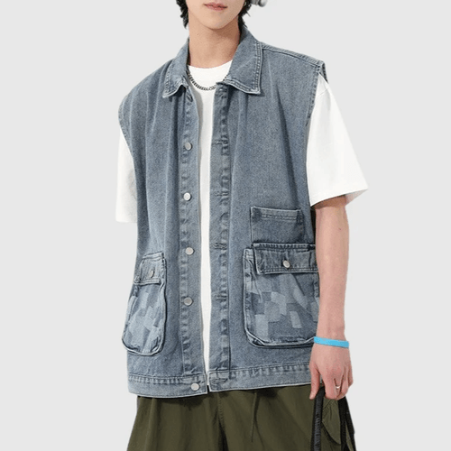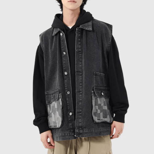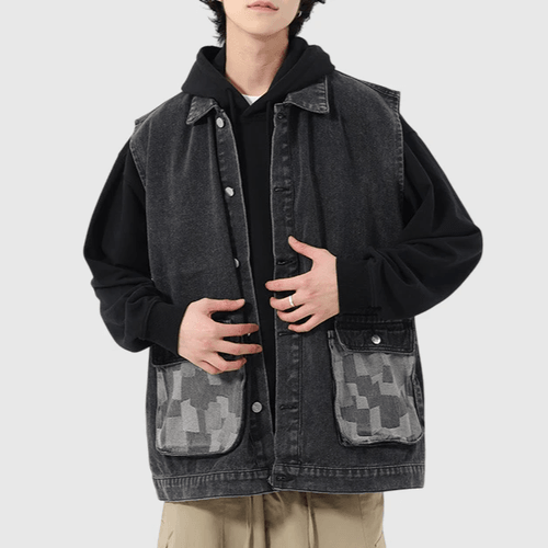 雙前袋撞色拼布縫接 背心水洗牛仔外套 [CBJ-1069]